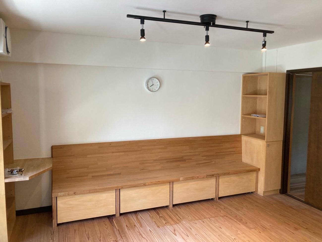 壁を塗り直し、照明は調光できるレール照明に。もとからあった収納ベンチと相性もいい
