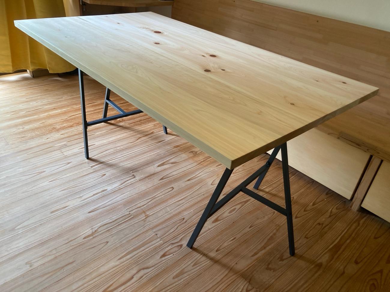 テーブルは六甲山材の活用に取り組む事業者であるシェアウッズさんに注文し、天板をつくってもらった。マンションから3キロ圏内の山にあった木だ